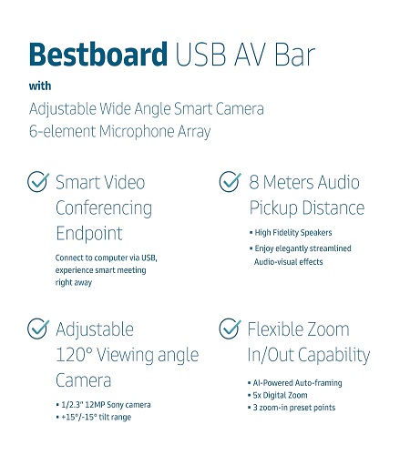 Description: Bestboard® USB AV Bar is a business-grade USB video soundbar that gives you a true studio-quality video calling experience and makes your hybrid working models easy-breezy as a Pro. Key Feature A perfect All-in-One videoconferencing endpoint for your computer via just one USB cable A conferencing-ready 4K UHD wide-angle camera and 5x zoom ensures everyone is in the picture and gives you an immersive experience for video calls Supports up to 3 preset zoom-in points and up to 30° manual tilt range (+15°-15°) for better and faster zoom accuracy A studio-quality audio system with 8W speaker and 6-element MEMS microphone array that equips Adaptive Echo Cancellation, Auto Gain Control, Anti-Reverberation and Noise Reduction, nicely pick-ups your voice within an 8-meter range and delivers a crystal-clear audio experience during meetings Main Specifications Model Name S5VB2 Camera 12MP CMOS Sensor, FOV 120°, Fixed Focus, 5X Digital Zoom Microphone 6 MEMS Microphone Array Speaker 8W Output USB Type-C x1, AUX 3.5mm x1 Input AUX 3.5mm x1 Net Weight 1.01Kg Package Content S5VB2 x1 Remote Controller x1 International Travel Plug Adapter x1 Magnetic Lens Cover x1 Wall-mounted rack x1 USB Cable x1 User Manual x1 Warranty Card x1