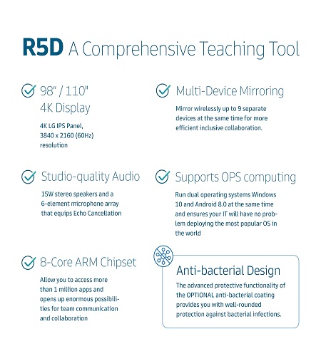 Bestboard® R5D is well designed and carefully curated to be a comprehensive teaching tool for modern flipping learning; it combines Interactive Whiteboard, Stereo Audio System and Wireless Mirroring/Broadcasting Servers, R5D’s intelligent design solves the hassles of complex AV integration and transforms your conventional classroom into a future-proof ready Hybrid Teach workspace. Key Feature The front panel I/O port design gives users easy access to the flexibility of a USB/HDMI/Touch/Power Button which is especially needed in classroom environments. An all-around interactive whiteboard feature that allows teachers to complete annotations on a large canvas-like digital whiteboard, so creativity and ideas aren't limited onsite. A studio-quality audio system with 15W stereo speakers makes the media lecture loud and clear. A wireless content sharing hub for up to 9 BYOD devices mirroring their screens wirelessly to an R5G display or broadcasting R5G content to their tablet or Chromebook - supports Windows 10, macOS, iOS, Android, and Chrome OS Embedded Android OS 8.0 and a powerful 8-Core ARM chipset allow you to access more than 1 million apps and opens up enormous possibilities for team communication and collaboration Supports OPS computing, you can now run dual operating systems Windows 10 and Android 8.0 at the same time and ensures your IT will have no problem deploying the most popular OS in the world