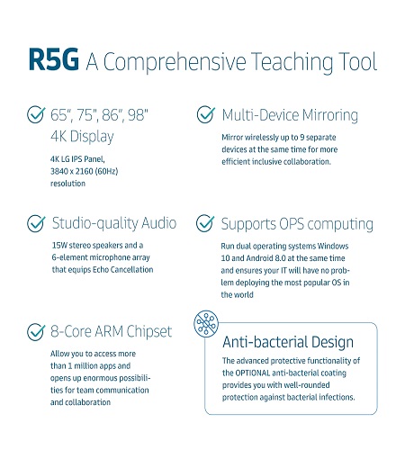 Description Bestboard® R5G is well designed and carefully curated to be a comprehensive teaching tool for modern flipping learning; it combines Interactive Whiteboard, Stereo Audio System and Wireless Mirroring/Broadcasting Servers, R5G’s intelligent design solves the hassles of complex AV integration and transforms your conventional classroom into a future-proof ready Hybrid Teach workspace. Key Feature The front panel I/O port design gives users easy access to the flexibility of a USB/HDMI/Touch/Power Button which is especially needed in classroom environments. An all-around interactive whiteboard feature that allows teachers to complete annotations on a large canvas-like digital whiteboard, so creativity and ideas aren't limited onsite. A conferencing-ready 8MP camera enables video in your classroom, and you can now activate distance learning in one place with just a single touch of your favorite apps such as Google Meet, Zoom, and more. A wireless content sharing hub for up to 9 BYOD devices mirroring their screens wirelessly to an R5G display or broadcasting R5G content to their tablet or Chromebook - supports Windows 10, macOS, iOS, Android, and Chrome OS Embedded Android OS 8.0 and a powerful 8-Core ARM chipset allow you to access more than 1 million apps and opens up enormous possibilities for team communication and collaboration Supports OPS computing, you can now run dual operating systems Windows 10 and Android 8.0 at the same time and ensures your IT will have no problem deploying the most popular OS in the world Main Specification Model Name: R5G Size: 65", 75", 86" and 98” Display: 4K IPS Panel, 3840 x 2160 (60Hz) resolution Glass: 7H Hardness Full laminated AG Explosion-Proof Matt Tempered Glass Protection: Anti-glare, Anti-blue light, Anti-fingerprint, Antibacterial (optional) Touch: 20-point Infrared Touch, supports Finger and Stylus Camera: 8MP CMOS Sensor, FOV 117° Microphone: 8-element Microphone Array Speaker: 15W x2 Embedded OS: Android 8.0 CPU: Dual-Core A73 + Dual-Core A53 GPU: Quad-Core Mali-G51 RAM: 4GB Storage: 32GB Connectivity: WiFi 5 (802.11 a/b/g/n/ac) Dual Band 2.4/5GHz, Bluetooth 4.0, LAN (Gigabit Ethernet 10/100/1000Mbps) Output: HDMI x1, AUX 3.5mm x1, SPDIF x1, USB-Touch x1 Input: USB Type-C x1, USB 3.0 x3, USB 2.0 x1, HDMI x3, VGA x1, AUX 3.5mm x1, RJ45 x1, RS-232 x1 Language: English / French / Italian / Spanish / Portuguese / Russian / Polish / Arabic / Simplified Chinese / Traditional Chinese / Japanese / Korean / Thai / Vietnamese Package R5G x1 Infrared Stylus x2 Remote Controller x1 HDMI Cable x1 USB Cable x1 Power Adapter x1 Wall-mounted rack x1 Quick Guide x1 Warranty Card x1