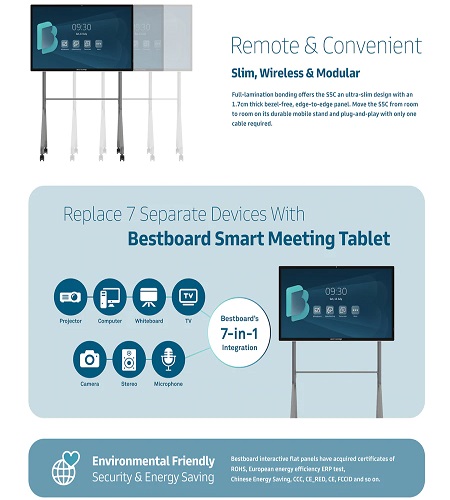 Description: Bestboard® S5 is essentially a powerful combination of Interactive Whiteboard, Videoconferencing Endpoint and Wireless Content Sharing Server, its All-In-One design solves the hassles of complex AV installation and blends perfectly with your office decorations in fashion. Bestboard® S5 transforms your conventional meeting room into a future-proof ready unified communication and collaboration workspace. Key Feature A Canvas-like Interactive Whiteboard allows you to make annotations page over page, and the capacitive stylus lets you write effortlessly just like the pen you used to have A conferencing-ready 8MP camera enables video in your meeting room, and you can now bring your remote teams together in one place with just one touch of your favorite apps such as Microsoft Teams, Cisco Webex, Zoom, and more A studio-quality audio system with 15W stereo speakers and a 4-element microphone array that equips Echo Cancellation, Vocal Enhancement and Noise Reduction, nicely pick-ups your voice within an 8-meter range and delivers a crystal-clear audio experience during meetings A wireless content sharing hub for up to 9 devices sharing their screens wirelessly during meetings - supports Windows 10, macOS, iOS and Android OS Embedded Android OS 8.0 and a powerful 8-Core ARM chipset allow you to access more than 1 million apps and opens up enormous possibilities for team communication and collaboration Supports OPS computing, you can now run dual operating systems Windows 10 and Android 8.0 at the same time and ensures your IT will have no problem deploying the most popular OS in the world Main Specification Model Name: S5C Size: 65" and 86" Display: 4K LG IPS Panel, 3840 x 2160 (60Hz) resolution Glass: 7H Hardness Full laminated AG Explosion-Proof Matt Tempered Glass Protection: Anti-glare, Anti-blue light, Anti-fingerprint, Antibacterial (optional) Touch: 10-point Capacitive Touch (up to 40-point), supports Finger and Stylus 4096-Level Pressure Sensitivity Camera: 8MP CMOS Sensor, FOV 84°, Auto Focus Microphone: 4-element Microphone Array Speaker: 15W x2 Embedded OS: Android 8.0 CPU: Dual-Core A73 + Dual-Core A53 GPU: Quad-Core Mali-G51 RAM: 4GB Storage: 32GB Connectivity: WiFi 5 (802.11 a/b/g/n/ac) Dual Band 2.4/5GHz, Bluetooth 4.0, Dual LAN RJ45 (Gigabit Ethernet 10/100/1000Mbps) Output: HDMI x1, AUX 3.5mm x1, SPDIF x1 Input: USB Type-C x1, USB 3.0 x2, USB 2.0 x1, USB-Touch x1, DP x1, HDMI x2, VGA x1, AUX 3.5mm x1, RS-232 x1 Dimension (LxWxH): 1511.5 x 60 x 866.5mm (65"), 1978 x 60 x 1149mm (86") Net Weight: 49Kg (65”), 88.8Kg (86”) Package S5C x1 Stylus x1 Remote Controller x1 Power Adapter x1 Wall-mounted rack x1 User Manual x1 Warranty Card x1